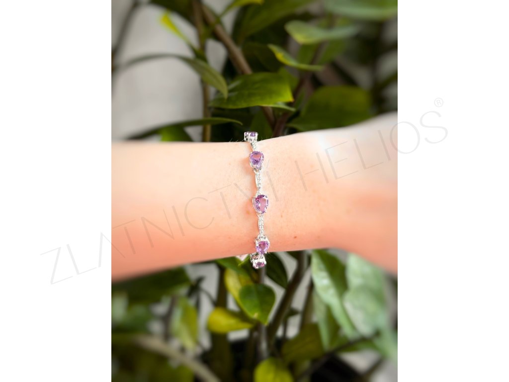 Strieborný náramok s Ametystovými kvapkami a zirkónmi vloženými medzi nimi. Ametyst pre znamenie zverokruhu Ryby, Strelec, Panna, Kozorožec . Je kameň meditácie a čistoty ducha, smeruje naše myslenie k tvorivej práci a prebúdza v nás intuíciu.