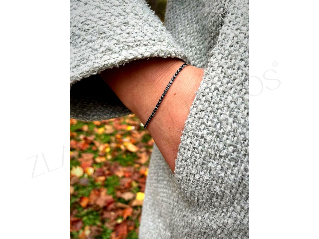 Jemný náramok z chirurgickej ocele zdobený čiernymi lesklými kameňmi.