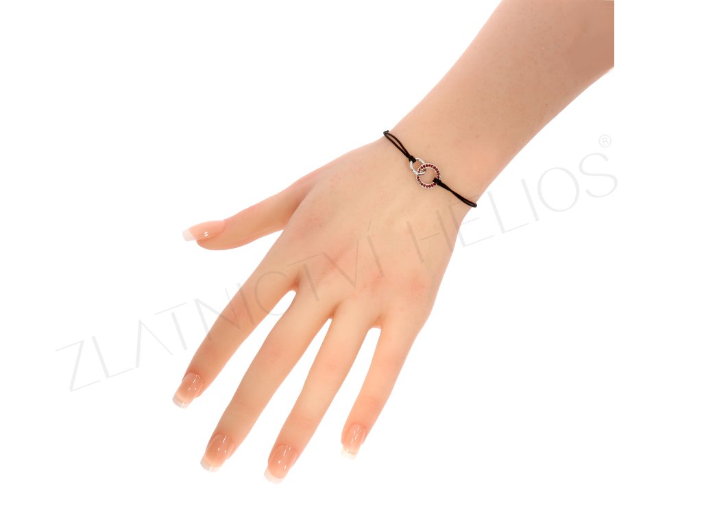 Šnúrkový náramok zdobený strieborným kolieskom s Českými granátmi a hladkým kolieskom.