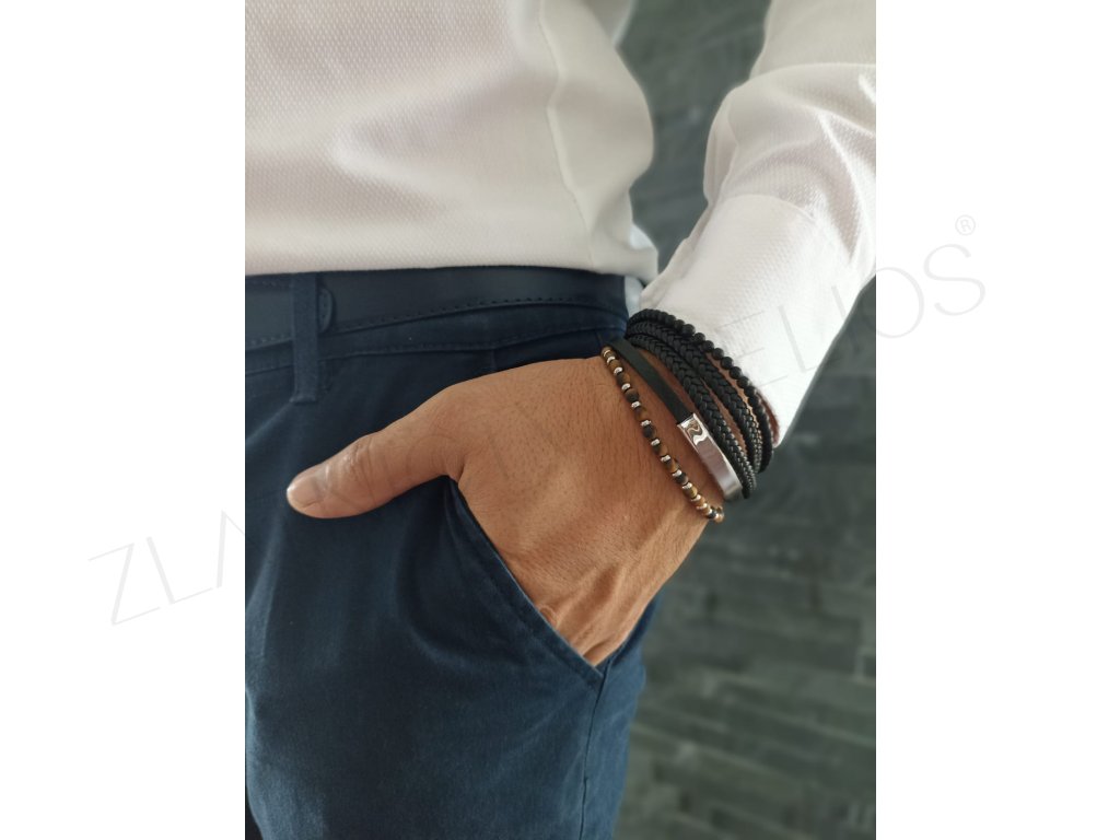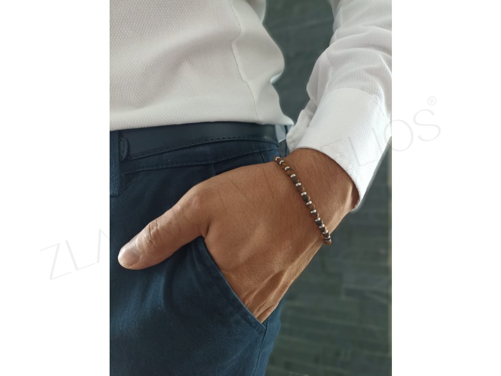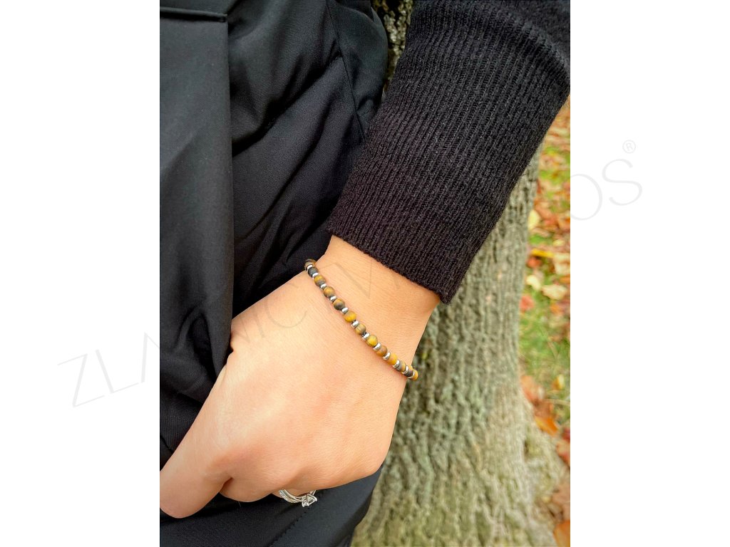 Náramok z chirurgickej ocele zdobený prírodnými kameňmi Tigrie oko . Náramok je možné pripnúť do dĺžky od 18cm až do 22cm preto je vhodný pre všetky ženy aj mužov .