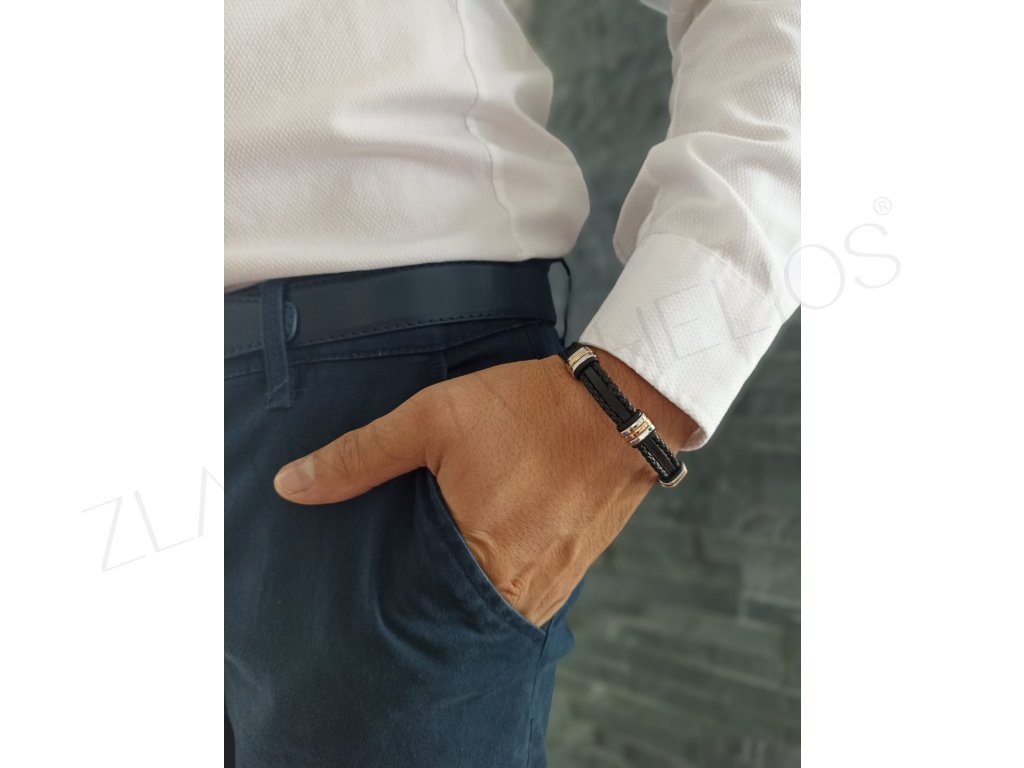 Náramok zo pozlátenej chirurgickej oceleOceľová časť lesklá a miestami pozlátenáKoža čiernaRozmery 21cmŠírka cca 12mm