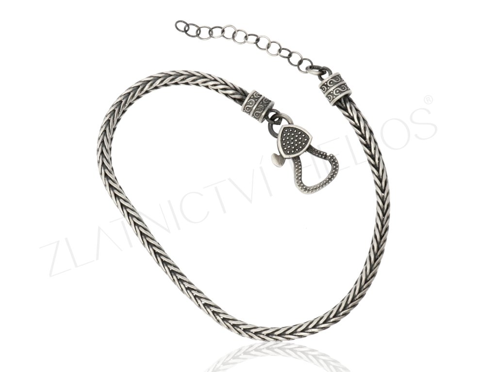 Strieborný náramok v matnom, patinovanom prevedení so zapínaním na zaujímavo spracovanú karabínou.