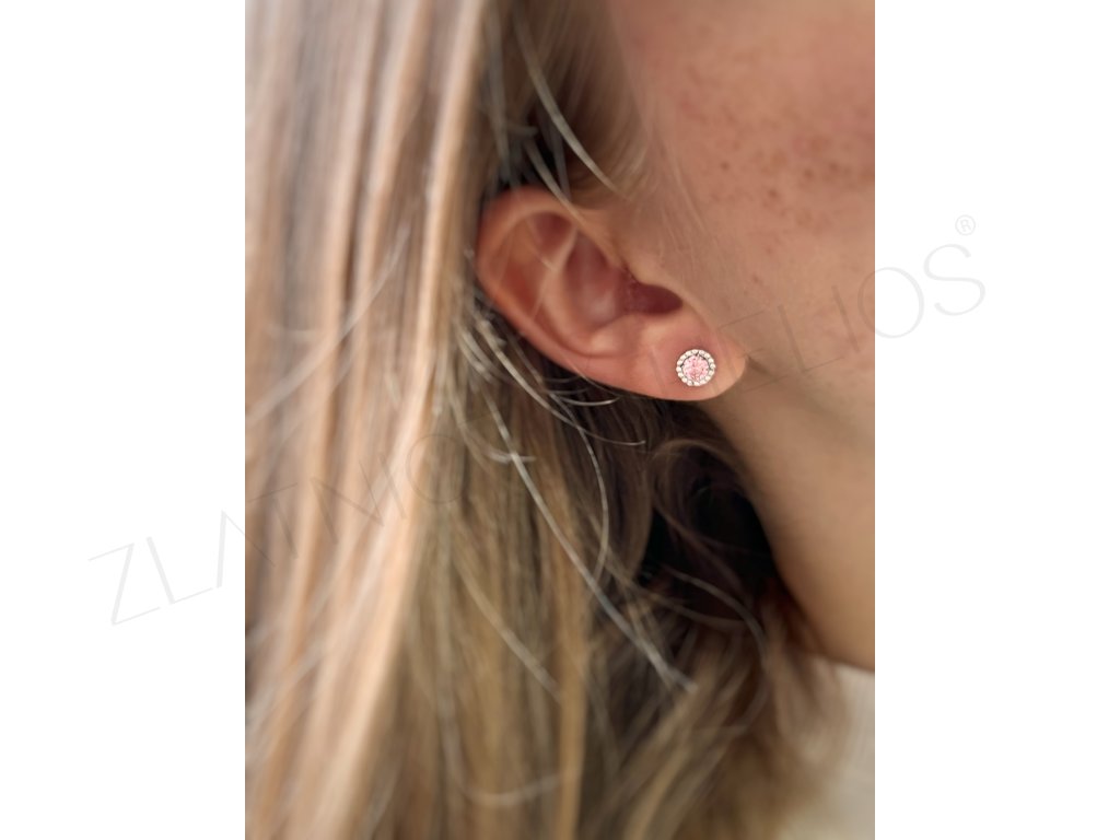 Náušnice z bieleho zlata zdobené trblietavými bielymi zirkónmi v ktorých strede je vsadený jeden centrálny ružový zirkón. Náušnice sa zapínajú na skrutky.