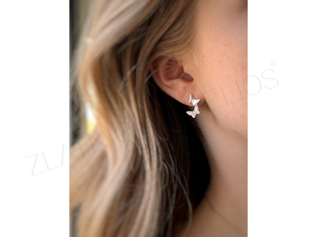 Efektné strieborné náušnice zložené z dvoch motýľov. Jeden motýlik je posádzaný zirkónmi a druhý v lesklom prevedení.