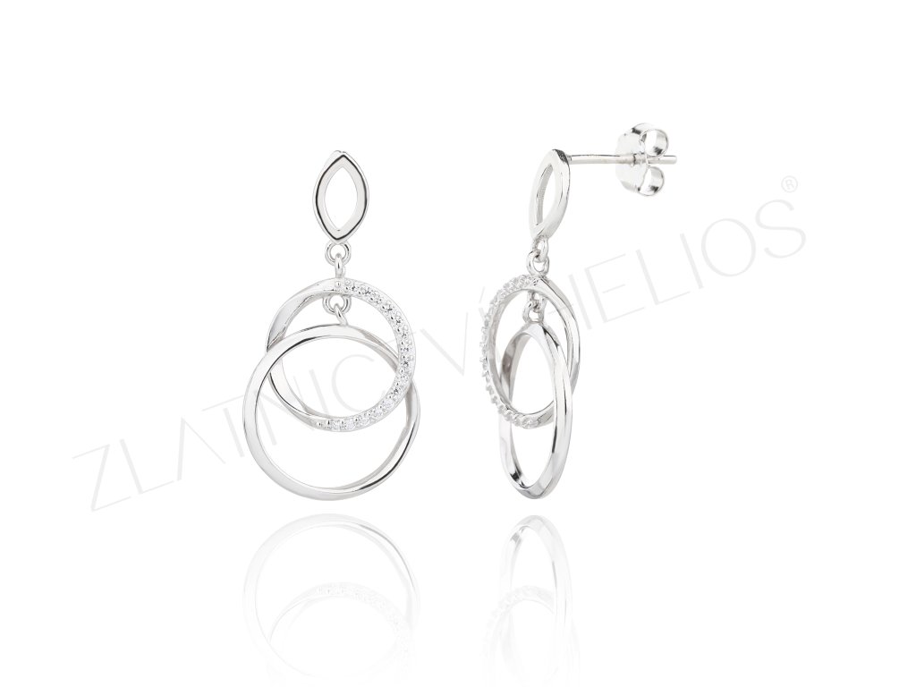 Strieborné visiace náušnice s kolieskami. Kolieska sú prepletené v sebe a voľne pohyblivé.