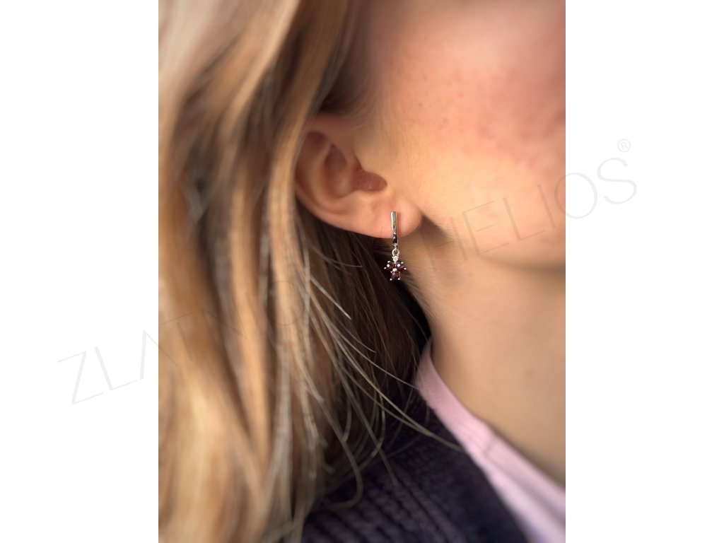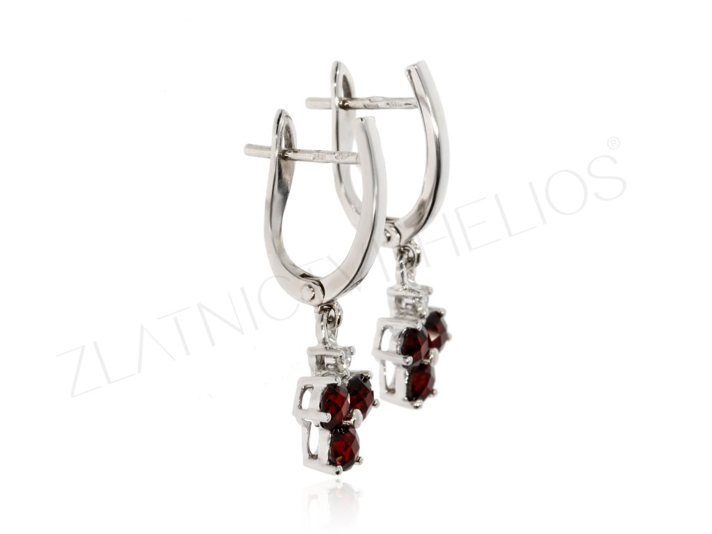 Zlaté visiace náušnice , ktorým dominujú granáty nad ktorými sú drobné diamanty . Náušnice z bieleho zlata na francúzske zapínanie.