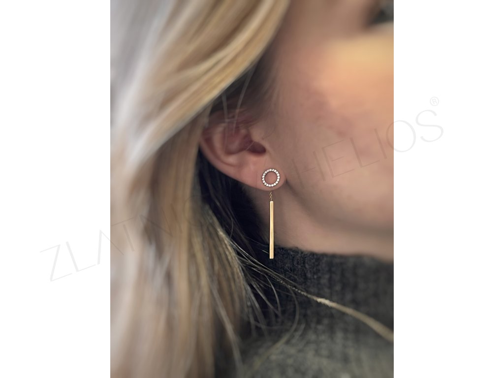 Zlaté visiace náušnice so zirkónmi. Efekt týchto náušníc spočíva v tom, že na zapínanie je pripevnená retiazka s tyčinkou, ktorá potom visí zo zadnej strany lalôčika.