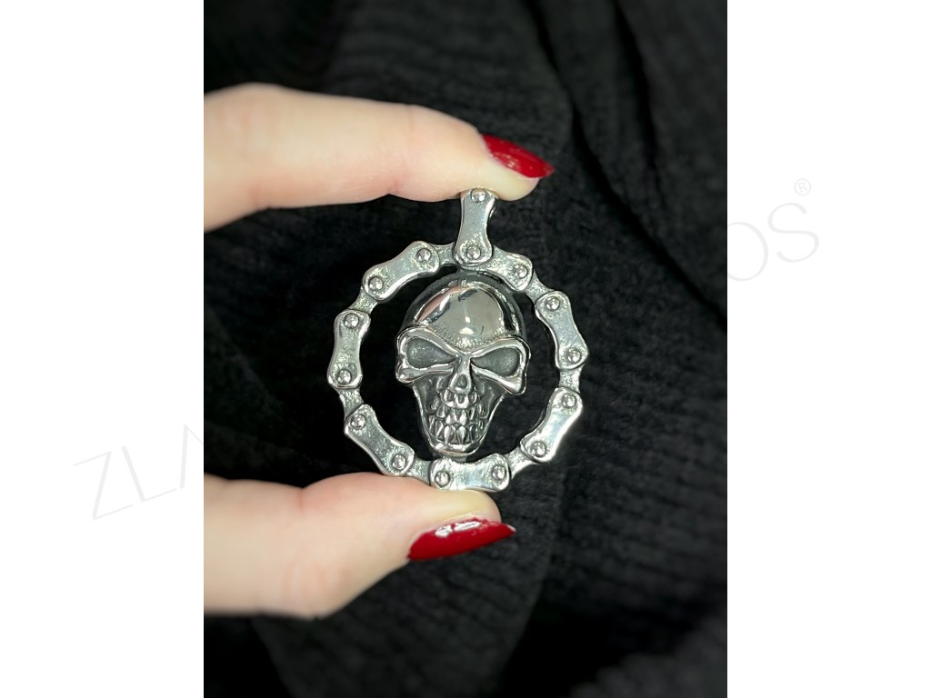 - zdobený lebkou obklopenou motocyklovou reťazou