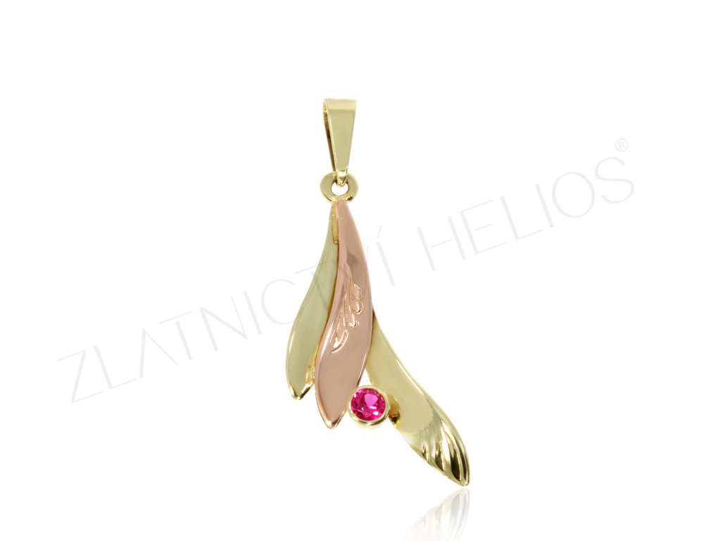 Prívesok vyrobený z kombinácie žltého a ružového zlata, zdobený červeným zirkónom a rytím.