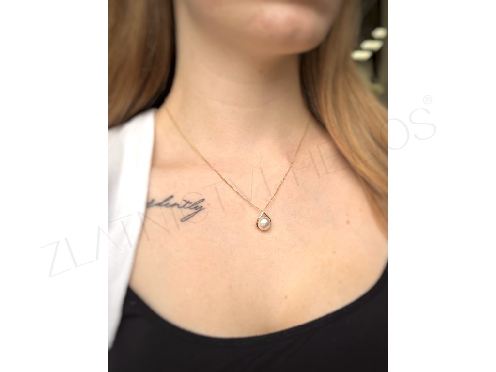 Prívesok zo žltého zlata ozdobený riečnou perlou a diamantmi. Nadčasové Perly sú pri tomto prívesku doplnené o žiarivé diamanty v jemnej línii nad perlou. V našej ponuke nájdete aj náušnice a prsteň v rovnakom dizajne.
