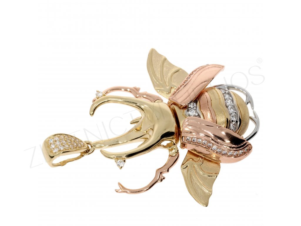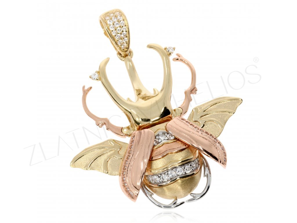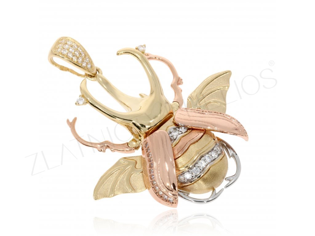 Luxusný prívesok z kombinovaného 14kt zlata Skarabeus , ktorý je výsledkom precíznej práce. Šperk má pohyblivé predné nožičky je zdobený zirkónmi a bielym ródiom. Nádherné 3D a realistické prevedenie chrobáka určite zaujme mužov aj ženy.