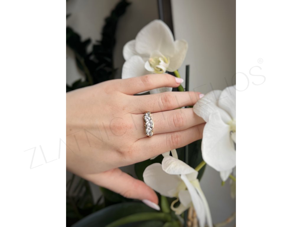 Luxusný prsteň bohato zdobený piatimi zaoblenými trojuholníkovými zirkónmi s prekrásnym leskom zasadenými do žltého zlata