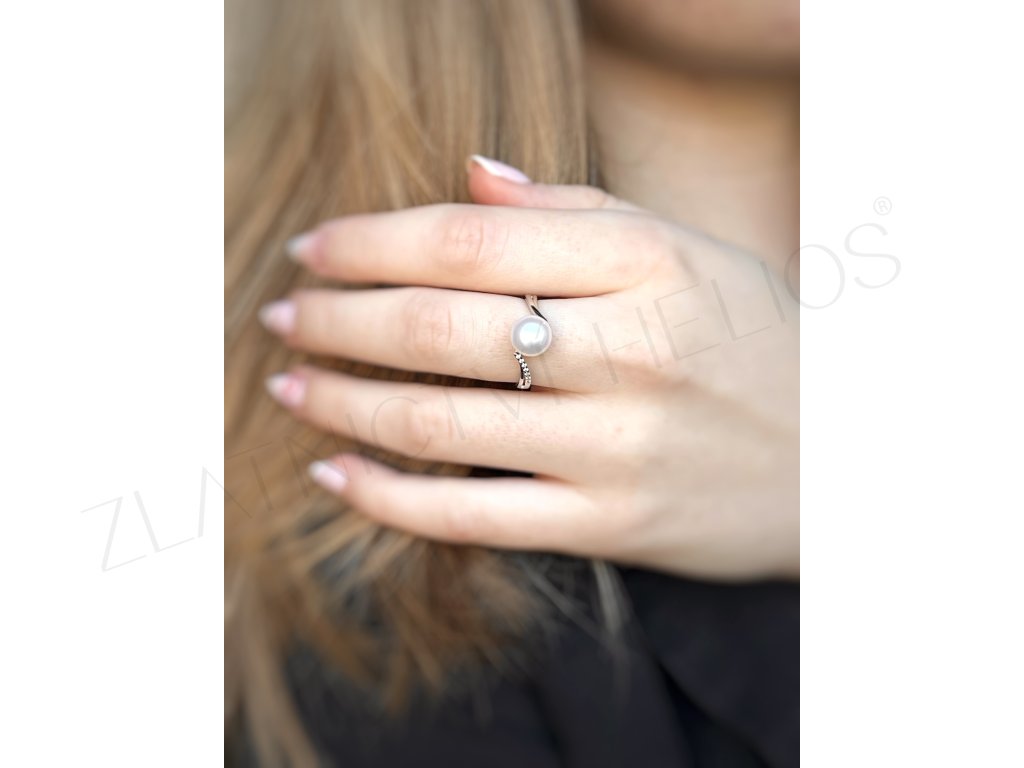 Prsteň z bieleho zlata zdobený pravou perlou a diamantmi v jemnej línii. Efektné uchytenie perly tvorí jedinečný šperk.