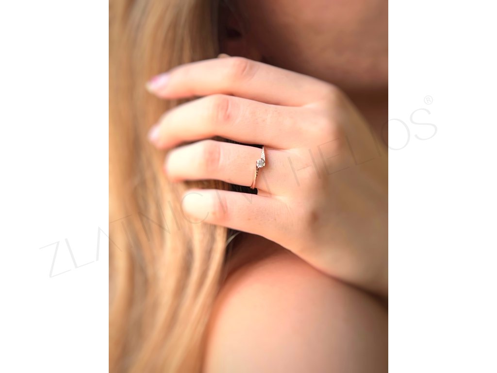 Jemný elegantný prsteň vyrobený z ružového zlata a zdobený nežným centrálnym zirkónom môže byť určený pre ženu ako darček z lásky, alebo odovzdaný ako prsteň zásnubný