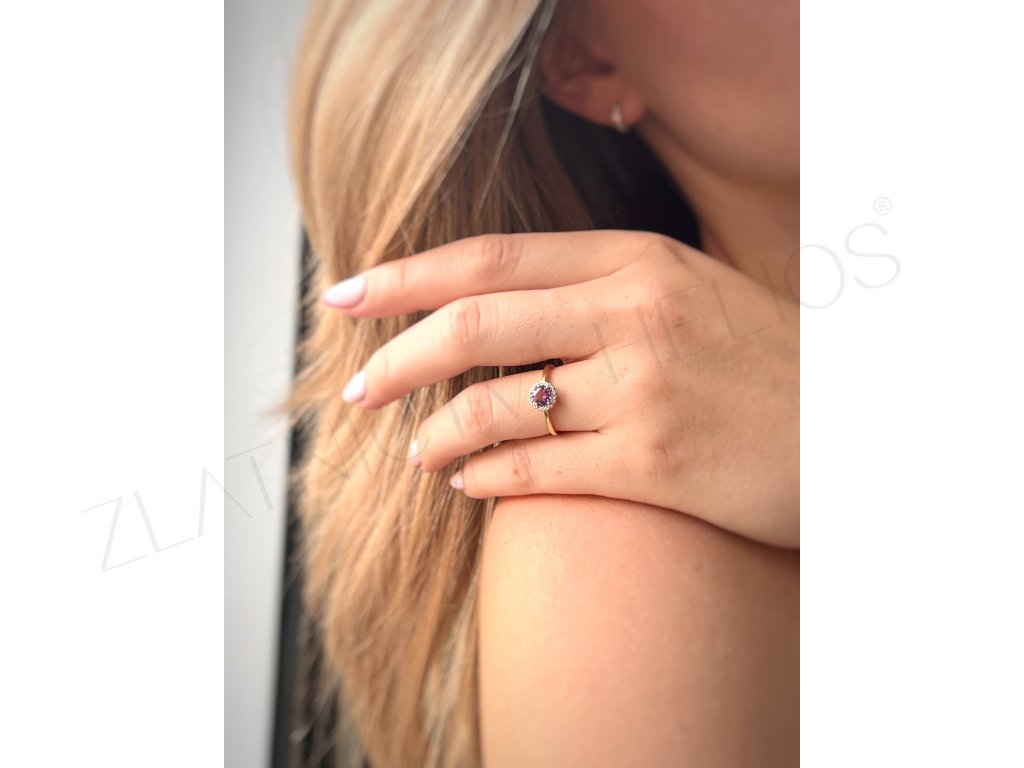 Prsteň zo žltého zlata zdobený pravým ametystom.