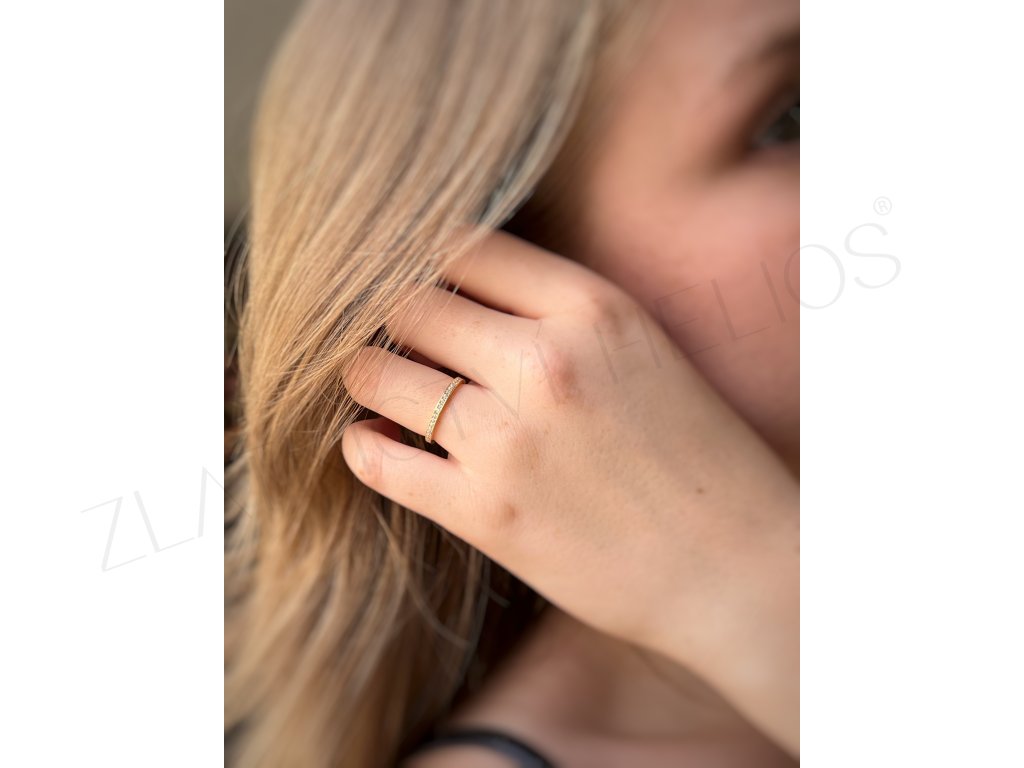 Prsteň zo žltého zlata v decentnom prevedení. Samostatná línia zirkónov je veľmi obľúbená pre svoju decentnú a nadčasovú eleganciu.