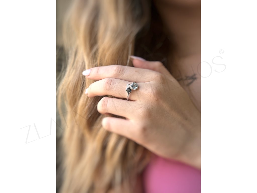 Prsteň z bieleho zlata zdobený diamantmi s briliantovým výbrusom a topazmi. Nežný svetlo modrý topás je hlavnou najvýraznejšou ozdobou. Jeho okrúhly tvar lemujú malé diamanty. Prsteň je možné do sady doplniť príveskom a náušnicami.