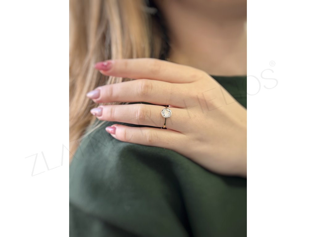 Jemný prsteň zo žltého 14 karátového zlata s rhodiovaním a vysokým leskom, zdobený jedným zirkónom. Tento klasický prstienok v sebe odráža jednoduchosť a eleganciu. Svojím štýlom sa hodí pre žiadosť o ruku, alebo ako darček pre ženy k narodeninám, alebo iné sviatočné príležitosti.