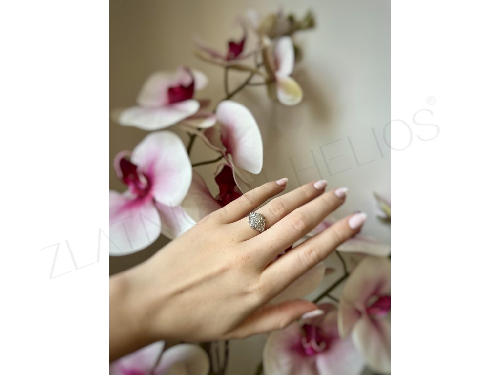 Tento úžasný prsteň vyrobený zo 14 karátového bieleho zlata so zirkónmi sa vyznačuje vysokým leskom a trblietkou. Hlavnou ozdobou prsteňa je nespočet jemných zirkónov, ktoré sú vsadené do oválneho kvetu. Nádherný prstienok je skvelou voľbou ako darček pre ženu k narodeninám, alebo výročiu.