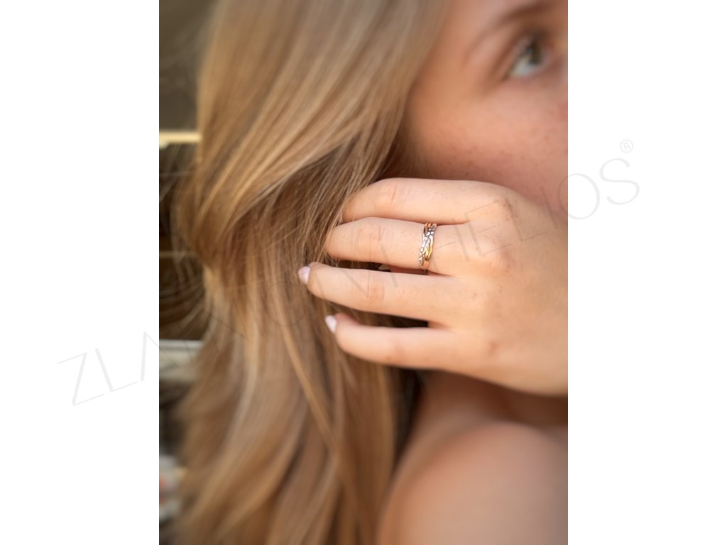 Zlatý prsteň v ktorom sa striedajú línie bielej a žltej. Biela rhodiovaná časť je zdobená tepanými plôškami, ktoré vynikajú svojim krásnym leskom.