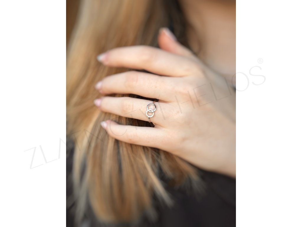Decentný prsteň s dvoma prepojenými krúžkami z bieleho zlata as briliantmi .