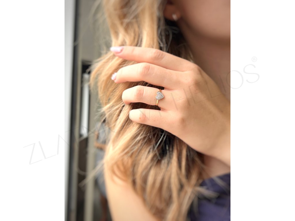 Zlatý prsteň srdce zdobený zirkónikmi.