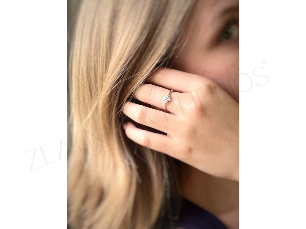 Romantický šperk, zásnubný prsteň vyrobený zo 14 karátového bieleho zlata, ktorý je obsypaný žiarivými zirkónmi do tvaru kvietky.