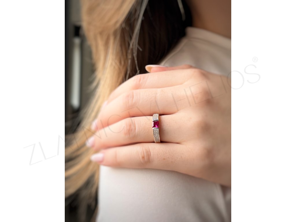 Zlatý prsteň s dominantným štvorcovým zirkónom v malinovej farbe s radom čírych zirkónov tvorí nádherný pár v tomto šperku zo žltého zlata.
