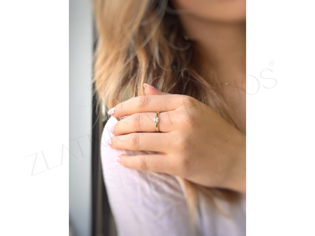 Nežný zlatý prsteň , ktorý je vhodný ako zásnubný. Zdobený jedným zirkónom.