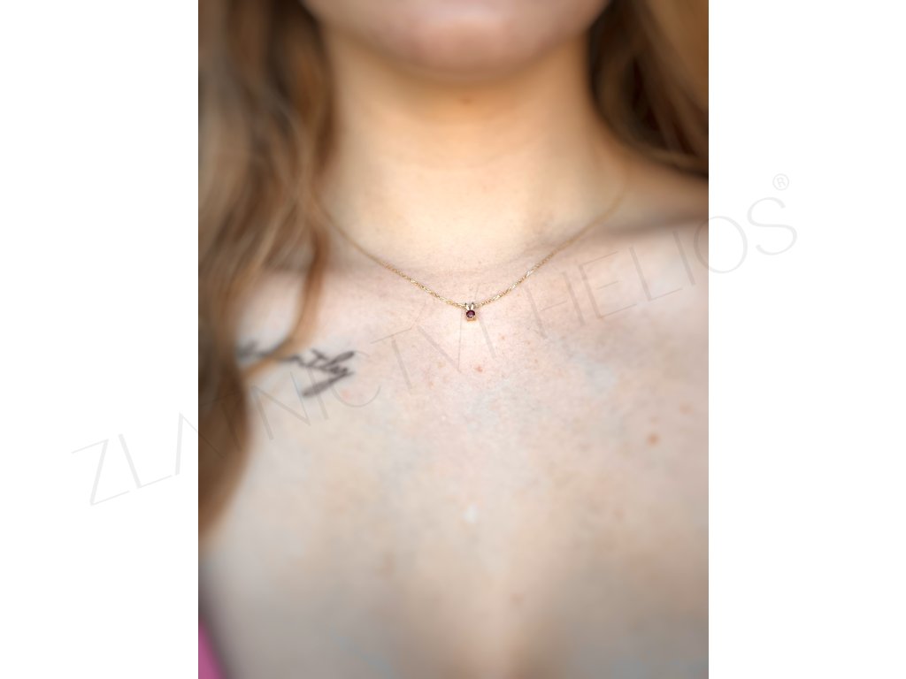 Zlatý náhrdelník pôvabne zdobený príveskom, kde je pevne vsadený rubín. Elegantný šperk možno doplniť aj náušnicami s rubínmi, ktoré nájdete tu .
