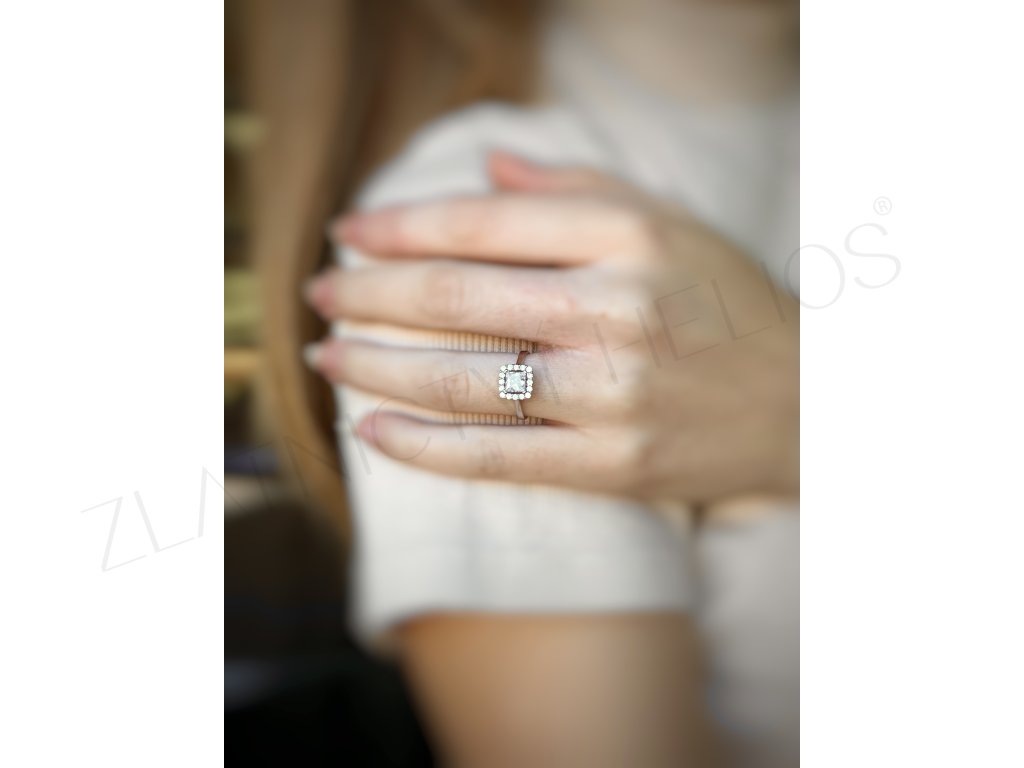 Trblietavý prsteň so štvorcovou ozdobou bohato posádzanou zirkónmi . Prsteň je vyrobený z bieleho zlata.