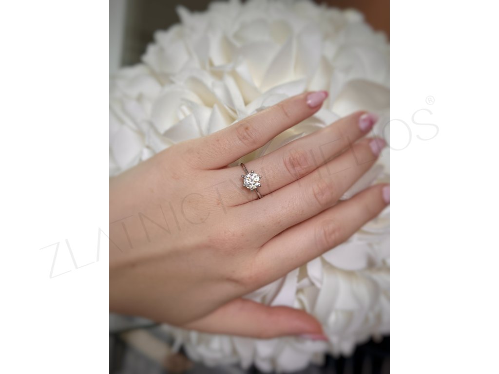Krásny zásnubný prsteň z bieleho 14-karátového zlata s centrálnym žiarivým zirkónom, v ktorom sa odráža jednoduchosť a elegancia. Mimoriadne výrazný kameň na prvý pohľad zaujme každú ženu a ani pre okolie nezostane bez povšimnutia. Neprehliadnuteľný kameň je precízne uchytený ao jeho stabilitu sa stará šesť krapien.