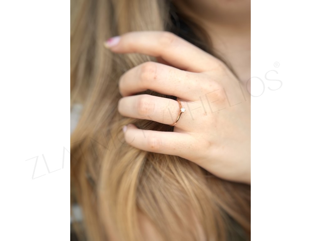 Jemný, nadčasový prsteň vyrobený zo 14karátového ružového zlata. Dominantou prsteňa je precízne uchytený centrálny diamant s briliantovým výbrusom, ktorý dozdobí aj tieto jemnejšie verzie prsteňov. Krásny zásnubný prsteň, ktorý poteší každú ženu. Súčasťou balenia je certifikát o pravosti kameňa.