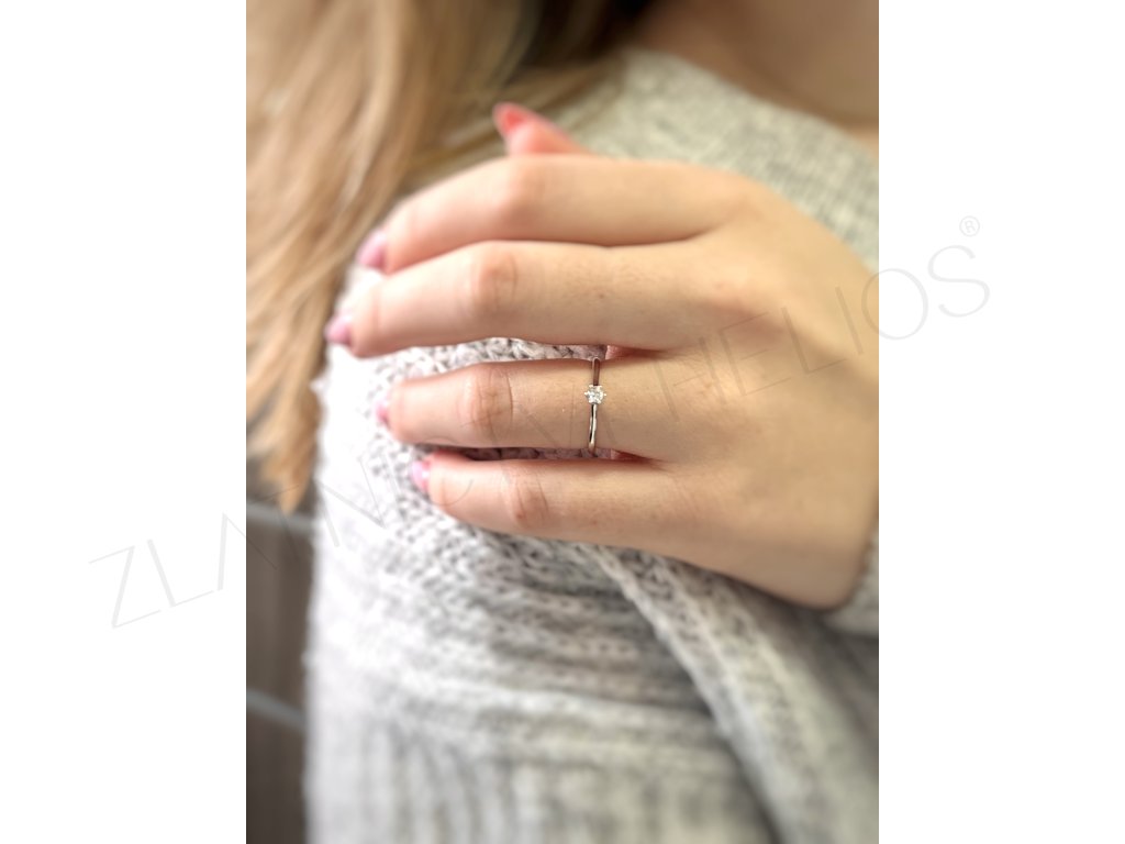 Tradičné zásnubný prsteň Vás zaujme na prvý pohľad svojim dizajnom. Prstienok zo 14kt bieleho zlata, kde hlavnou dominantou je číry Diamant s briliantovým výbrusom, ktorý je známy svojim krásnym leskom. Briliant je pevne vsadený v korunke a uchytený 6timi krapnami.