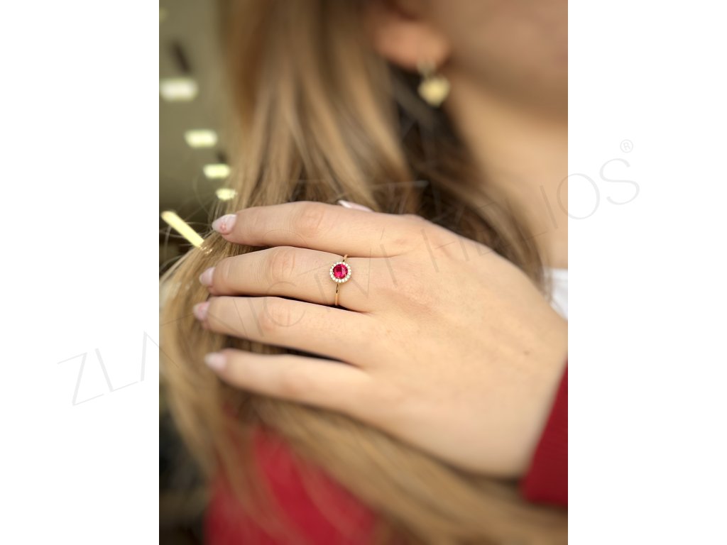 Prsteň vyrobený zo 14kt zlata , ktorému dominuje syntetický rubín. Žiarivý lesk dopĺňajú jemné číre zirkóny , ktoré v tesnej blízkosti kopírujú rubín. K tomuto prsteňu skvele doladíte z nášho výberu zlaté náušnice .