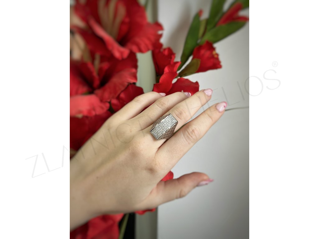 Nádherný a masívne prevedenie tohto prsteňa zaisťuje luxus pri nosení jeho hrdej majiteľke. Prsteň je vyrobený zo 14 karátového bieleho zlata zdobený mnohými zirkónmi , ktoré sú vsadené tesne vedľa seba a zaisťujú tak vysoký lesk . Luxusné prevedenie prsteňa je top medzi darčekmi pre ženu .