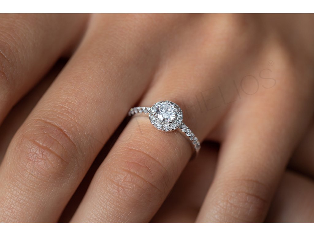 Netradičný prsteň vyrobený zo 14 karátového bieleho zlata . Tento prstienok s jemnými zirkónmi do okrúhleho tvaru, kde do stredu je pevne vsadený centrálny iskrivý zirkón . Skvelá voľba pre žiadosť o ruku, ale aj vhodný ako darček pre ženu k narodeninám, alebo výročie.