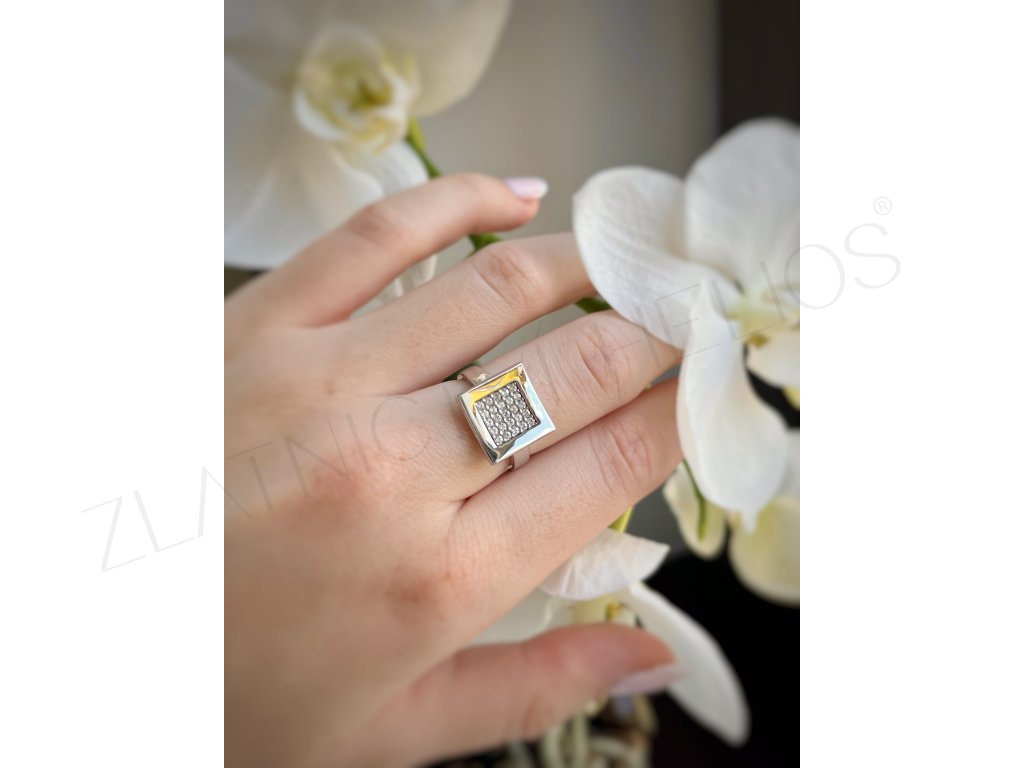 Zaujímavý prsteň zo 14 karátového bieleho zlata zdobený zirkónmi . Hlavnou ozdobou tohto prstienka je štvorcová ozdoba posádzaná zirkónmi tesne vedľa seba s neprekonateľným leskom. Tento prsteň je skvelý tip na darček pre ženu a možno ho doplniť o zlaté náušnice .