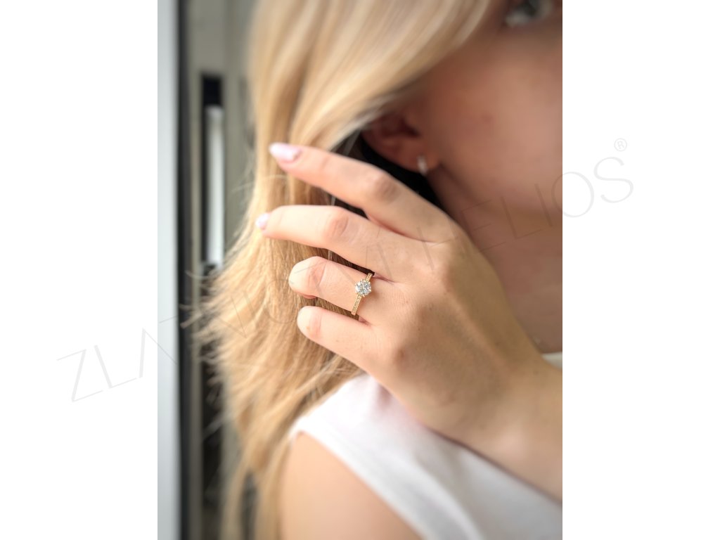 Dokonalý zásnubní prsten, jehož korunka ukrývá zářivý zirkon, který je broušený v briliantovém stylu a obklopují ho další jemné zirkony. Prsten je vyrobený ze žlutého 14 karátového zlata a bude ozdobou na každém prstu. Prstýnek je výjimečnou volbou pro ty, kteří chtějí své milované darovat opravdu jedinečný šperk.