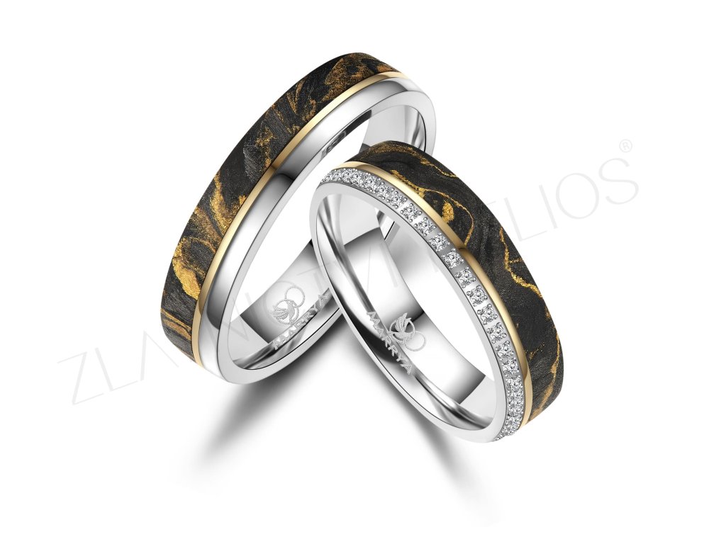 - Snubní prsteny z chirurgické oceli, zdobené carbonem a žilkami z bronzu