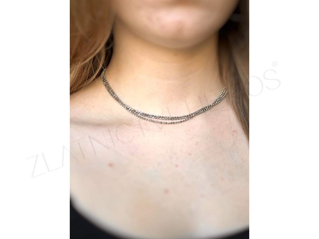 Krátký stříbrný náhrdelník s výrazným efektem, tvořený ze tří řad lesklých kuliček.