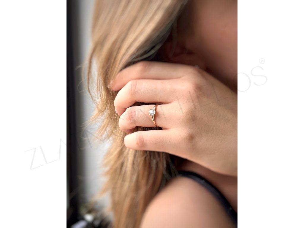 Něžný zlatý prsten zdobený výraznějším zirkonem kolem kterého jsou vsazené jemné, drobné zirkony.