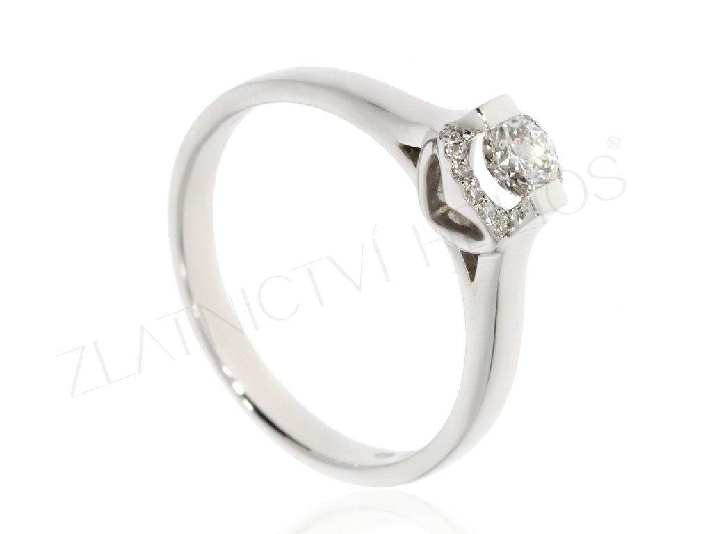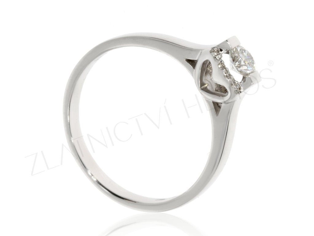 Prsten z bílého zlata zdobený diamanty a na boku u centrálního zirkonu drobným srdíčkem. Prsten je vhodný jako prsten zásnubní.