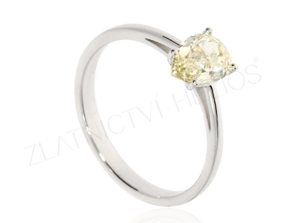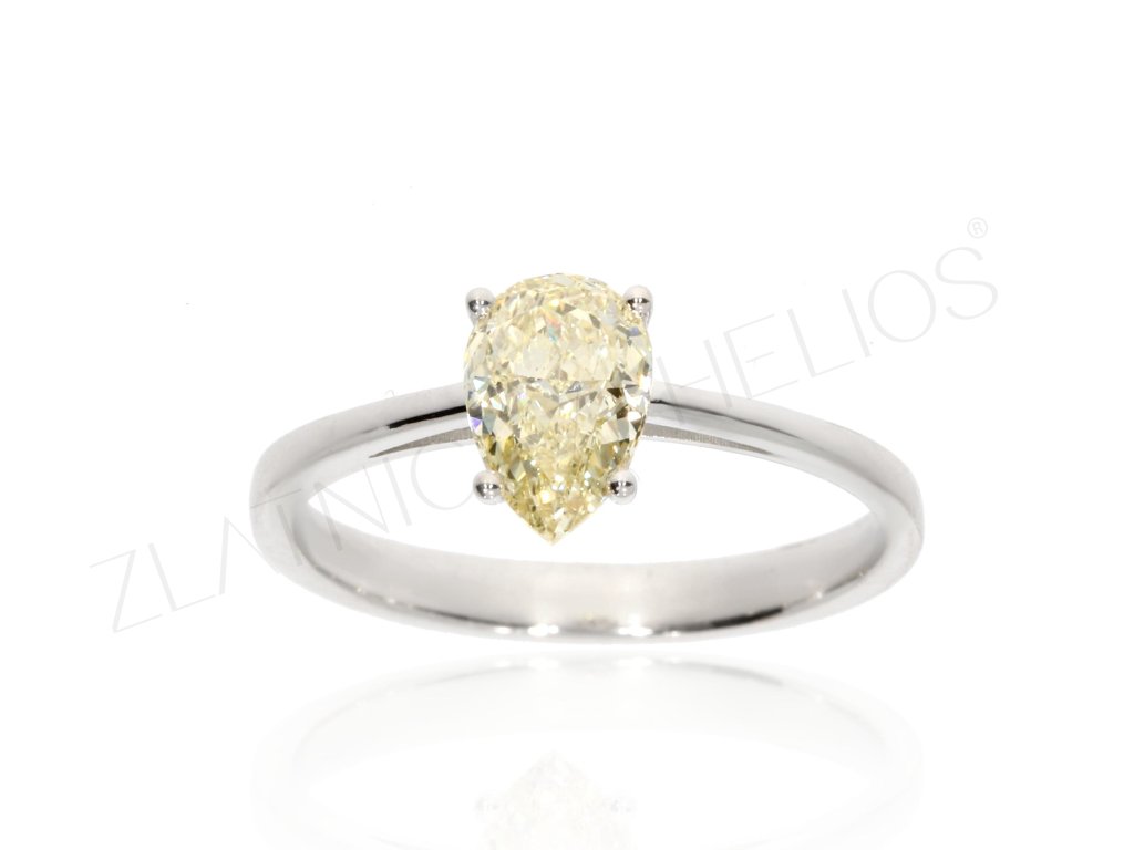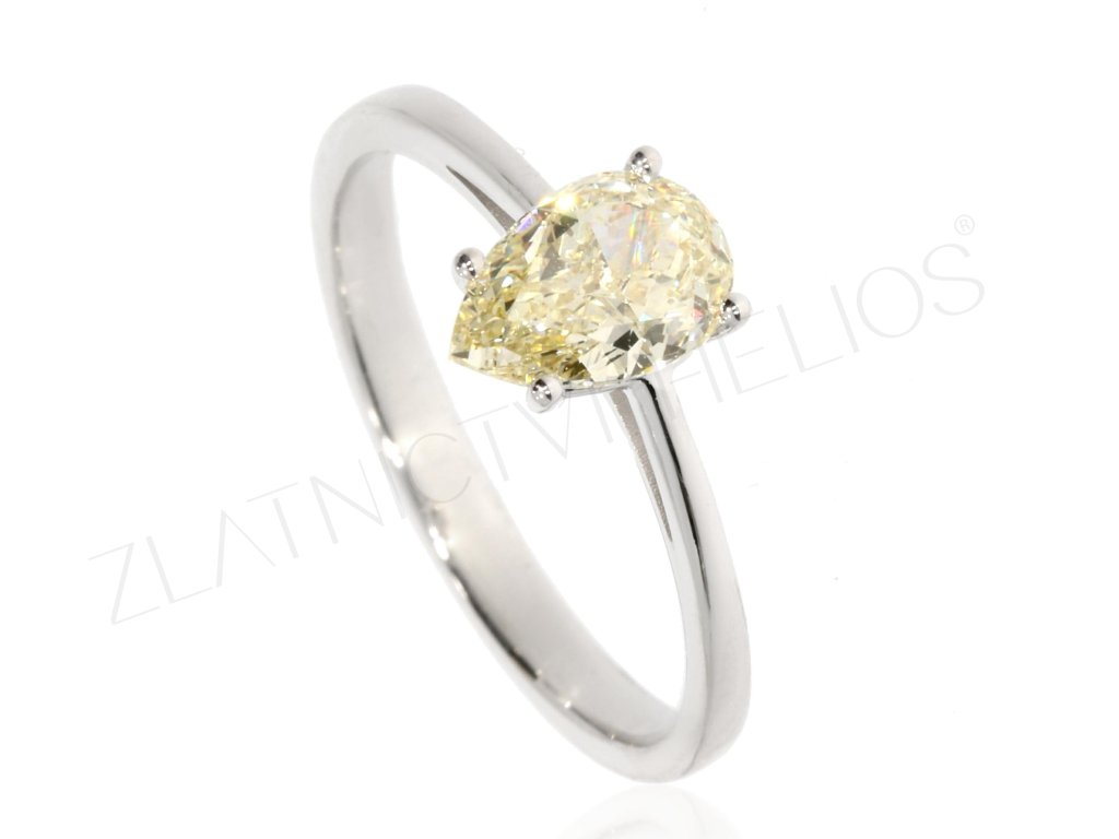 Luxusní prsten vyrobený z bílého 14k zlata, který zdobí 1ct Laboratorní diamant jemné žluté barvy s nádherným výbrusem do tvaru kapky. Uchycen je pomocí čtyř krapen a oplývá vysokým třpytem. Čistý a nadčasový design, který se skvěle hodí pro žádost o ruku, nebo může být úchvatným sběratelským kouskem i cennou investicí.