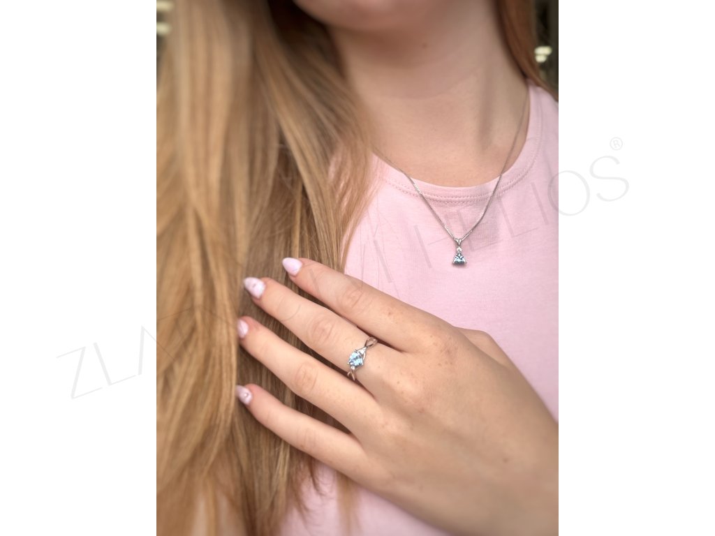 Prsten z bílého zlata s centrálním průzračně modrým zirkonem. V naší nabídce najdete také přívěsek do soupravy.