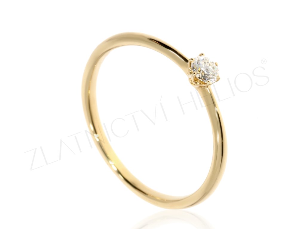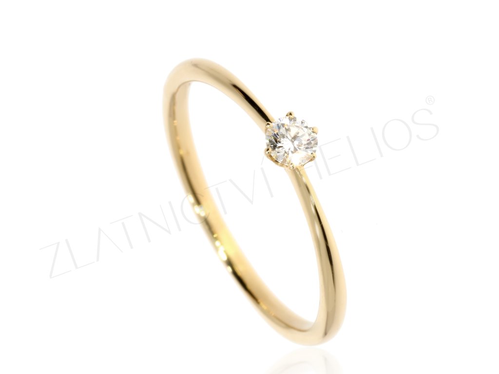 Zásnubní prstýnek ze 14kt žlutého zlata zdobený diamantem s briliantovým výbrusem, pevně vsazeným ve středové korunce.